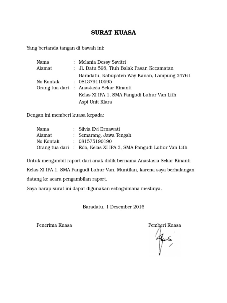 Berikut adalah contoh surat kuasa yang dapat digunakan sebagai referensi: